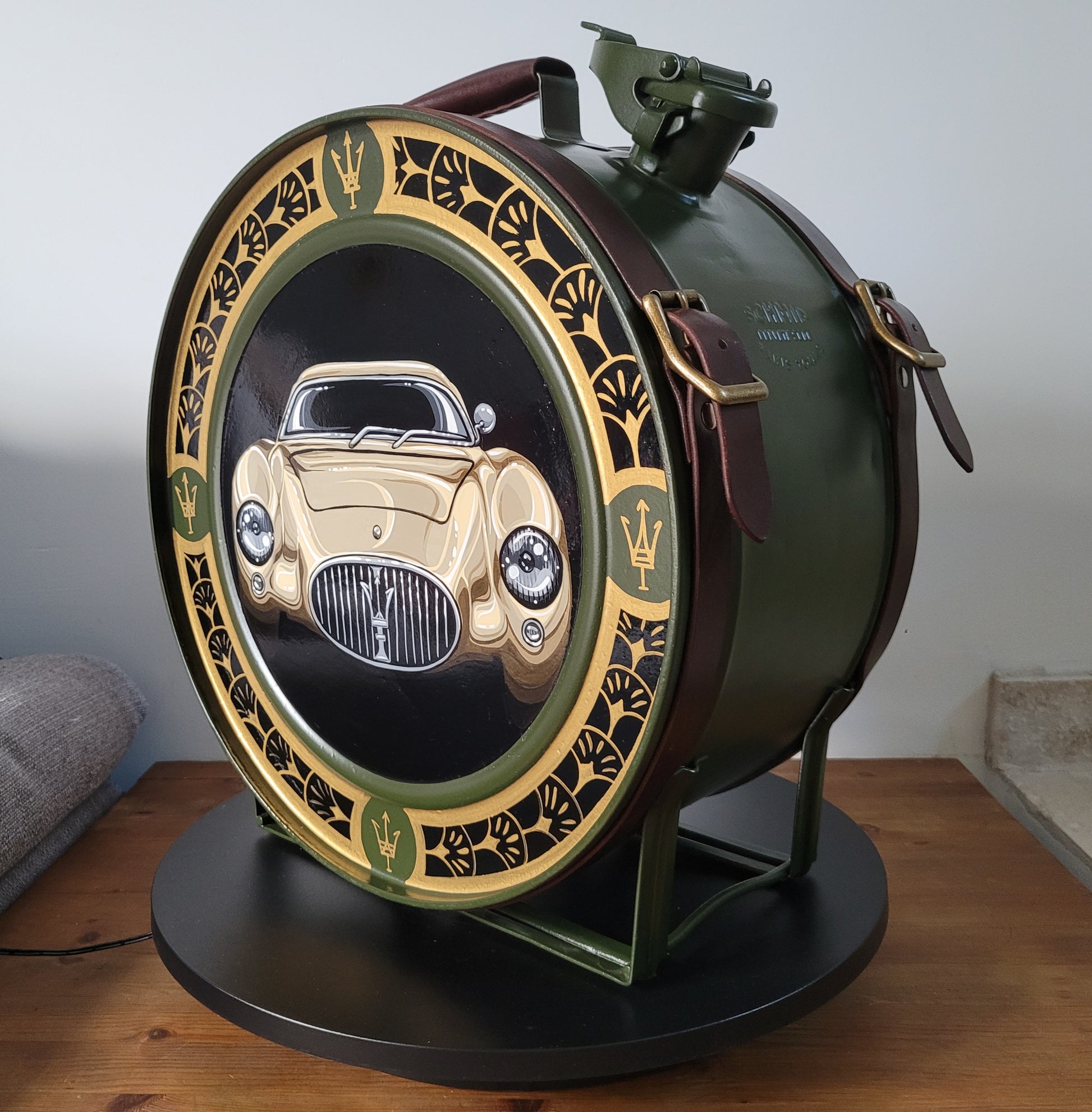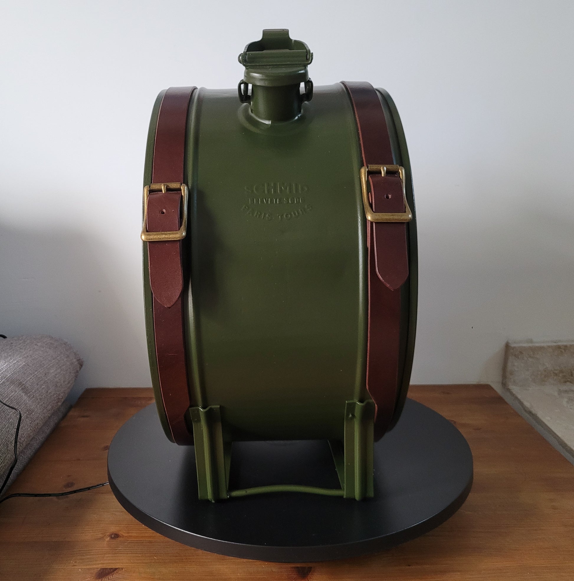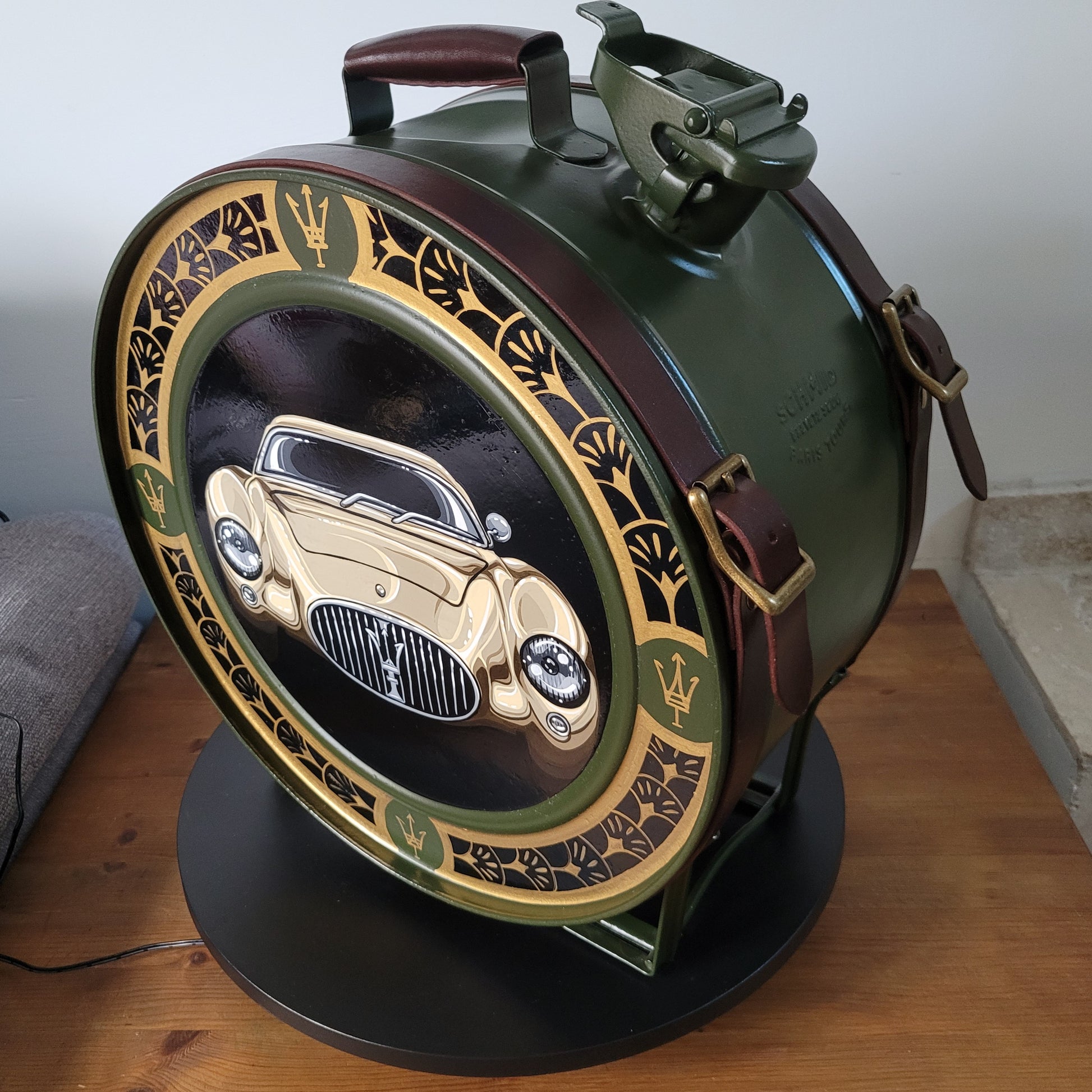 Réaliser à partir d'un ancien bidon d'essence , chiné , restauré , repeint puis habillé de sangles de cuirs avec boucles brossé doré . Ces petits détails qui allie Chic et Vintage .