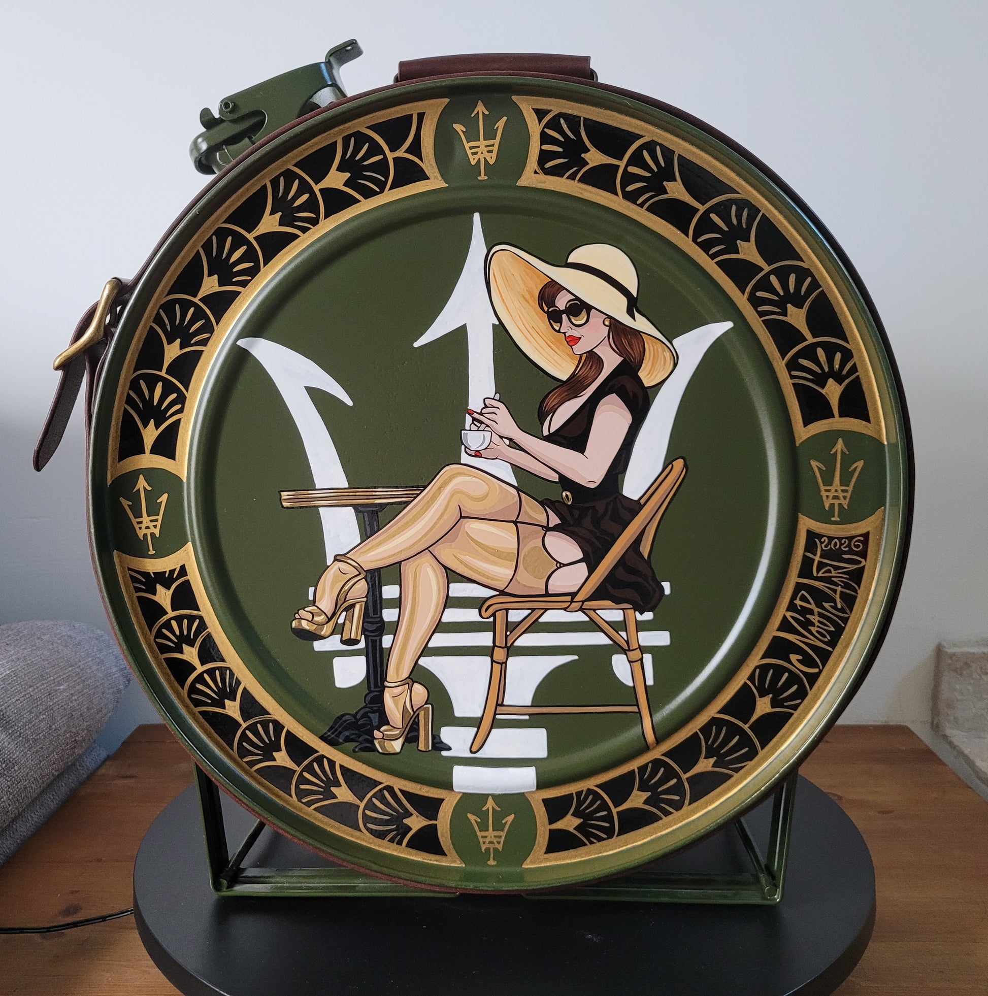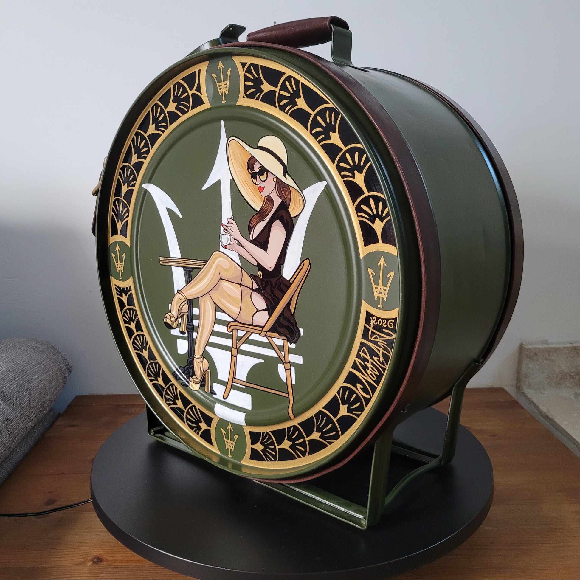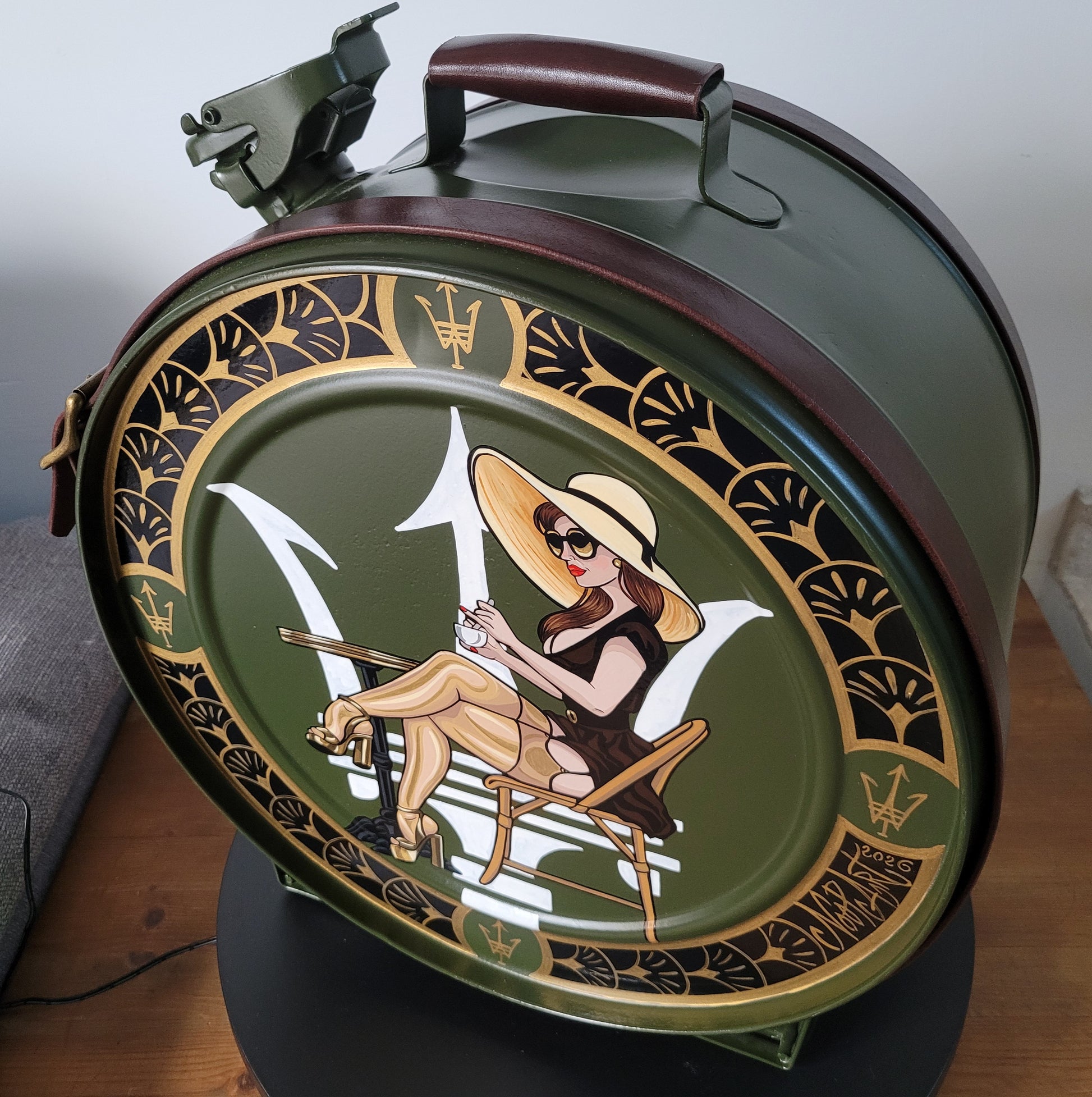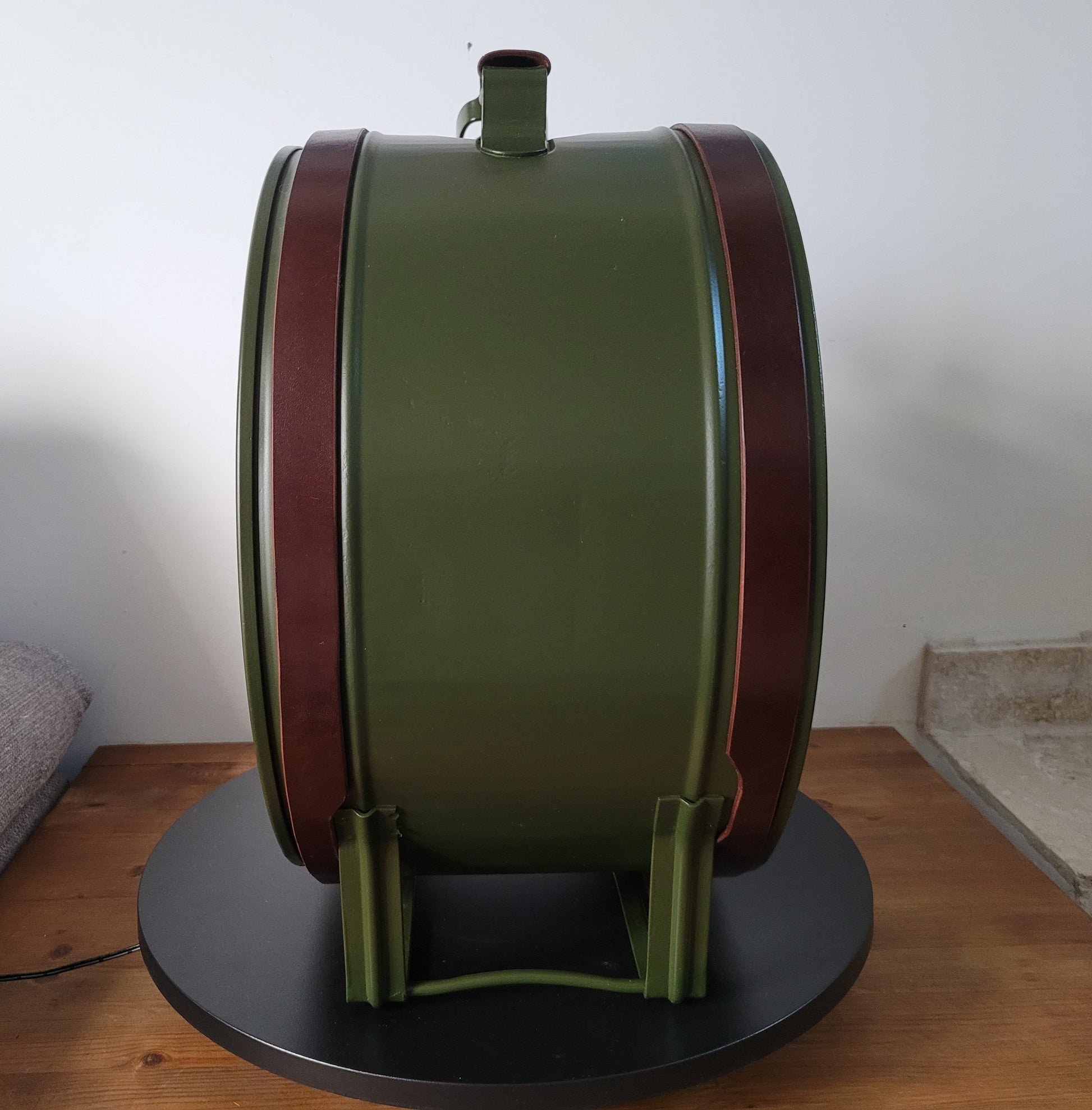 Réaliser à partir d'un ancien bidon d'essence , chiné , restauré , repeint puis habillé de sangles de cuirs avec boucles brossé doré . Ces petits détails qui allie Chic et Vintage .