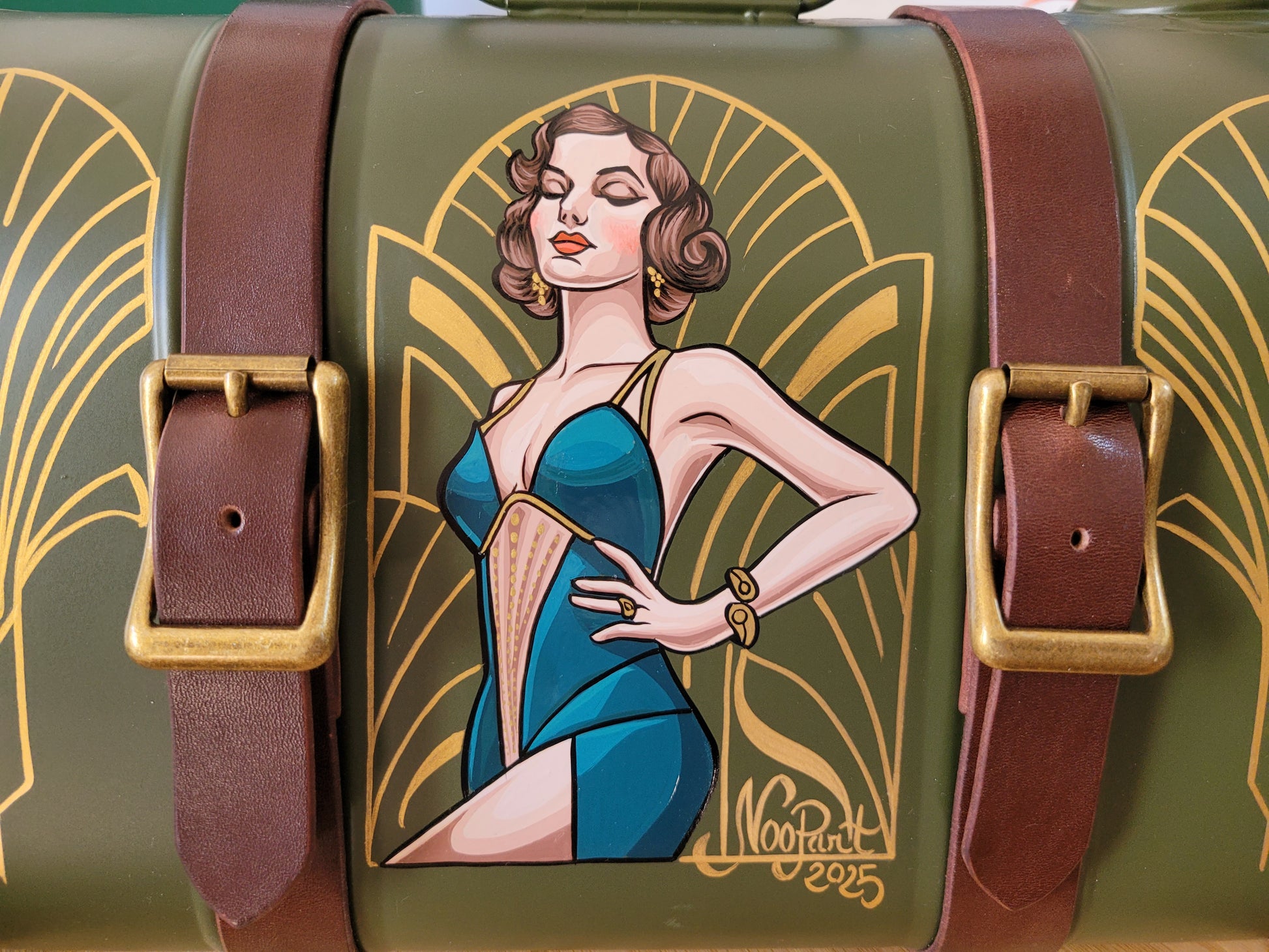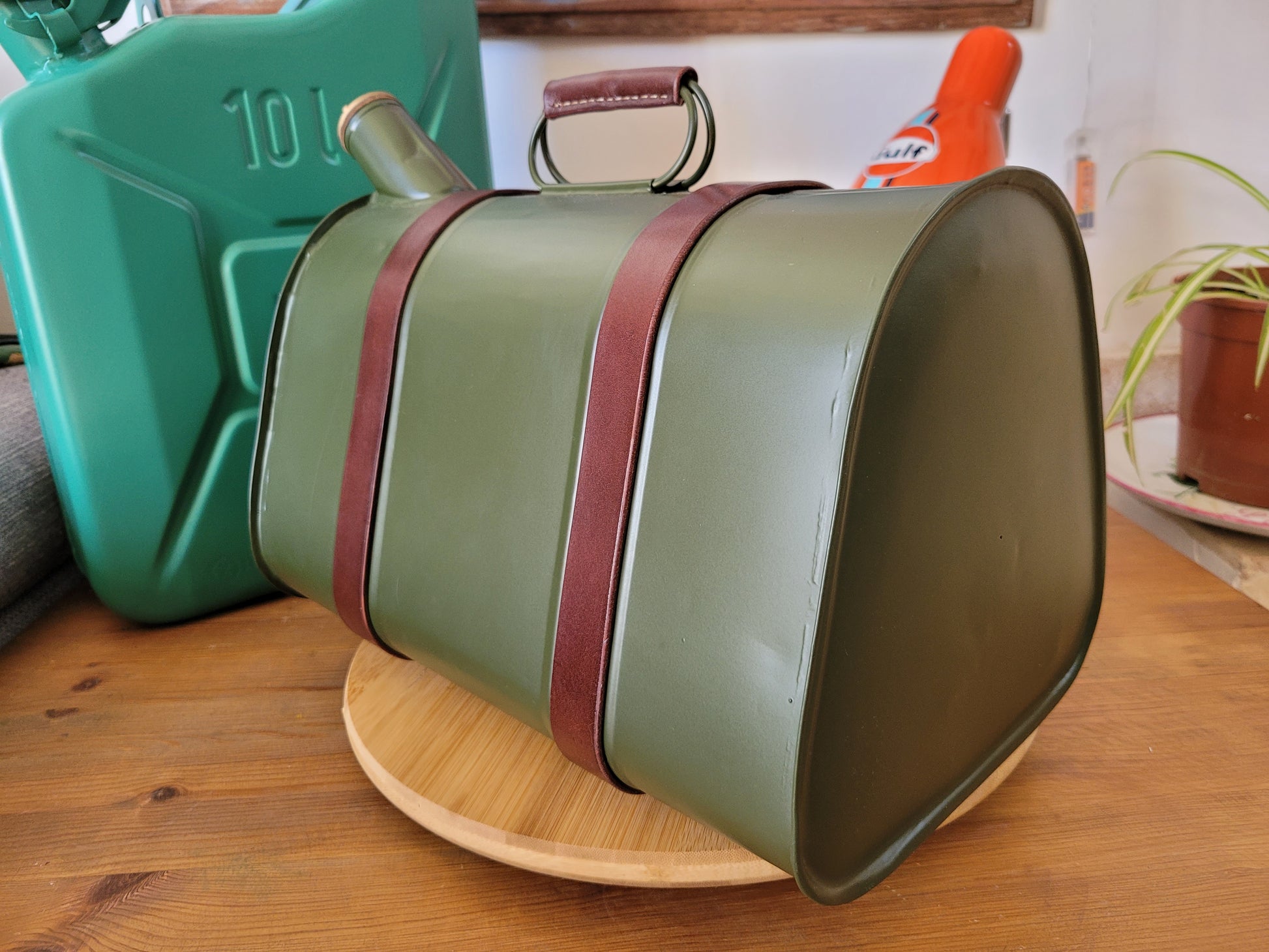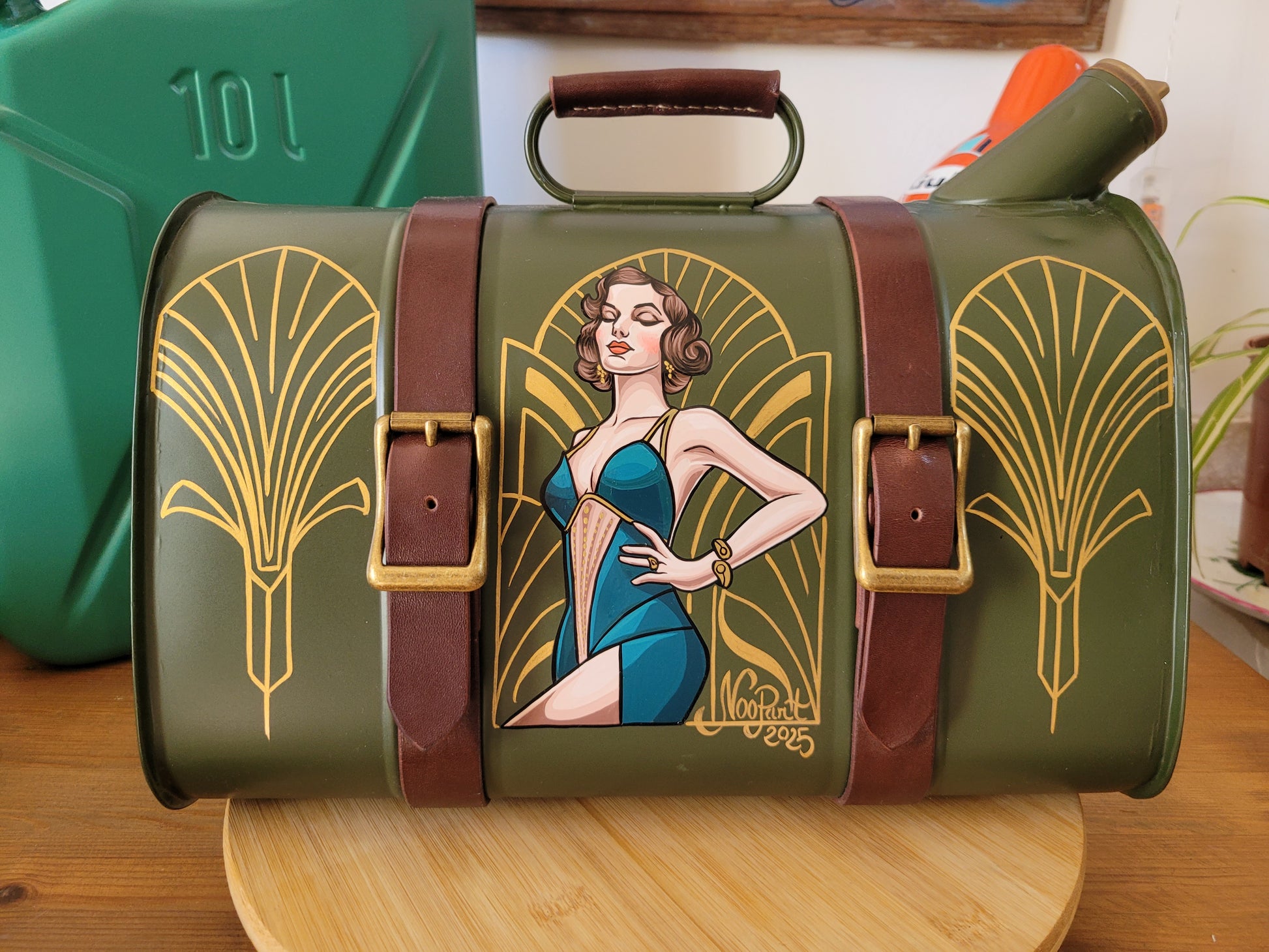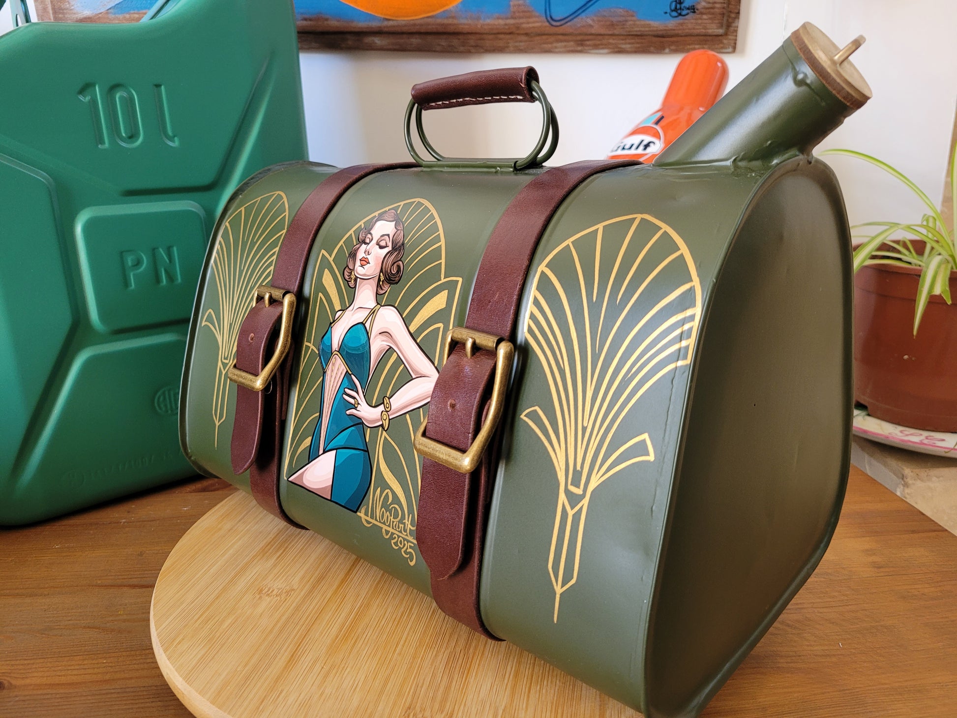 Réalisé à partir d'un ancien bidon d'essence restauré , repeint ... et comme ça suffisait pas , laissez dans les mains d'un sellier pour l'habiller de deux sangles de cuir et boucles en métal dorées pour donner tout son charme à cette mystérieuse élégante.