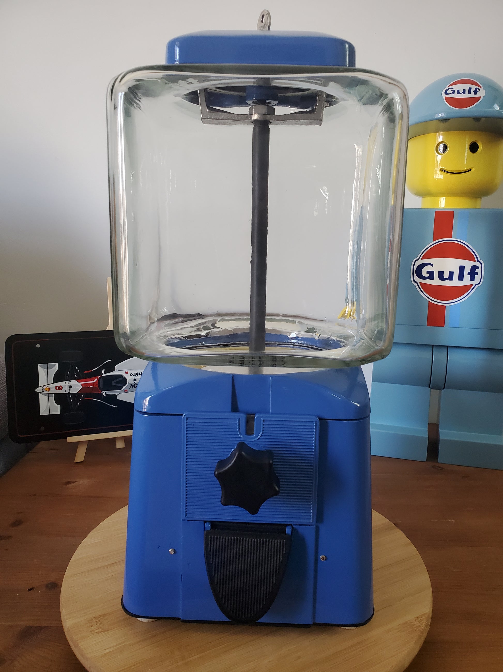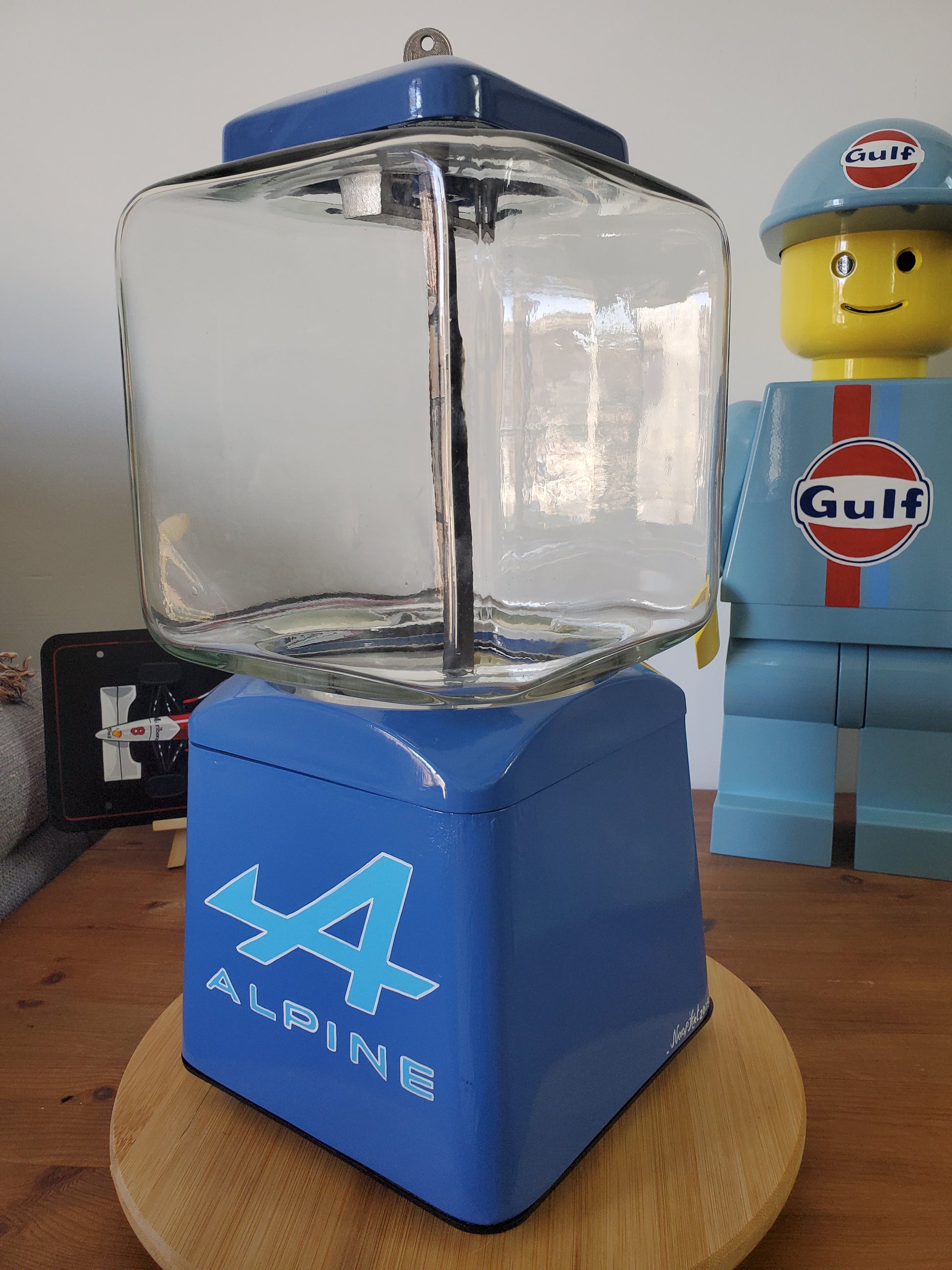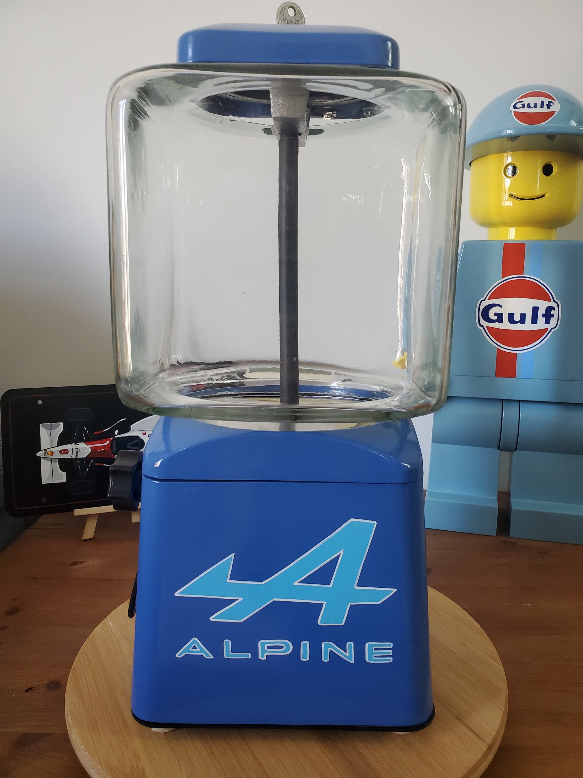 A l'occasion des 70 ans d'Alpine, ce véritable distributeur de bonbons des années 60' à été entièrement restauré et personnalisé aux couleurs de la marque Française.