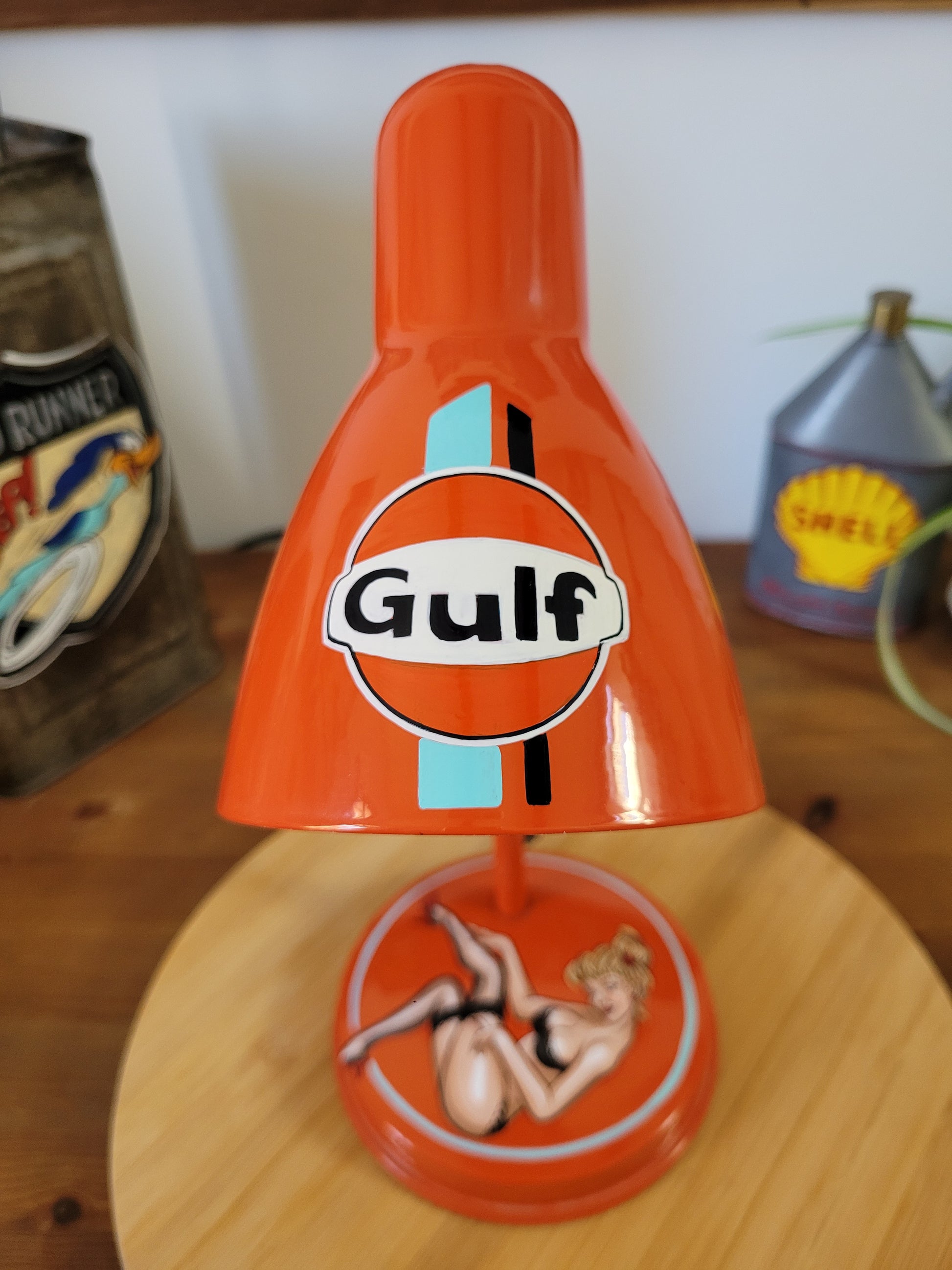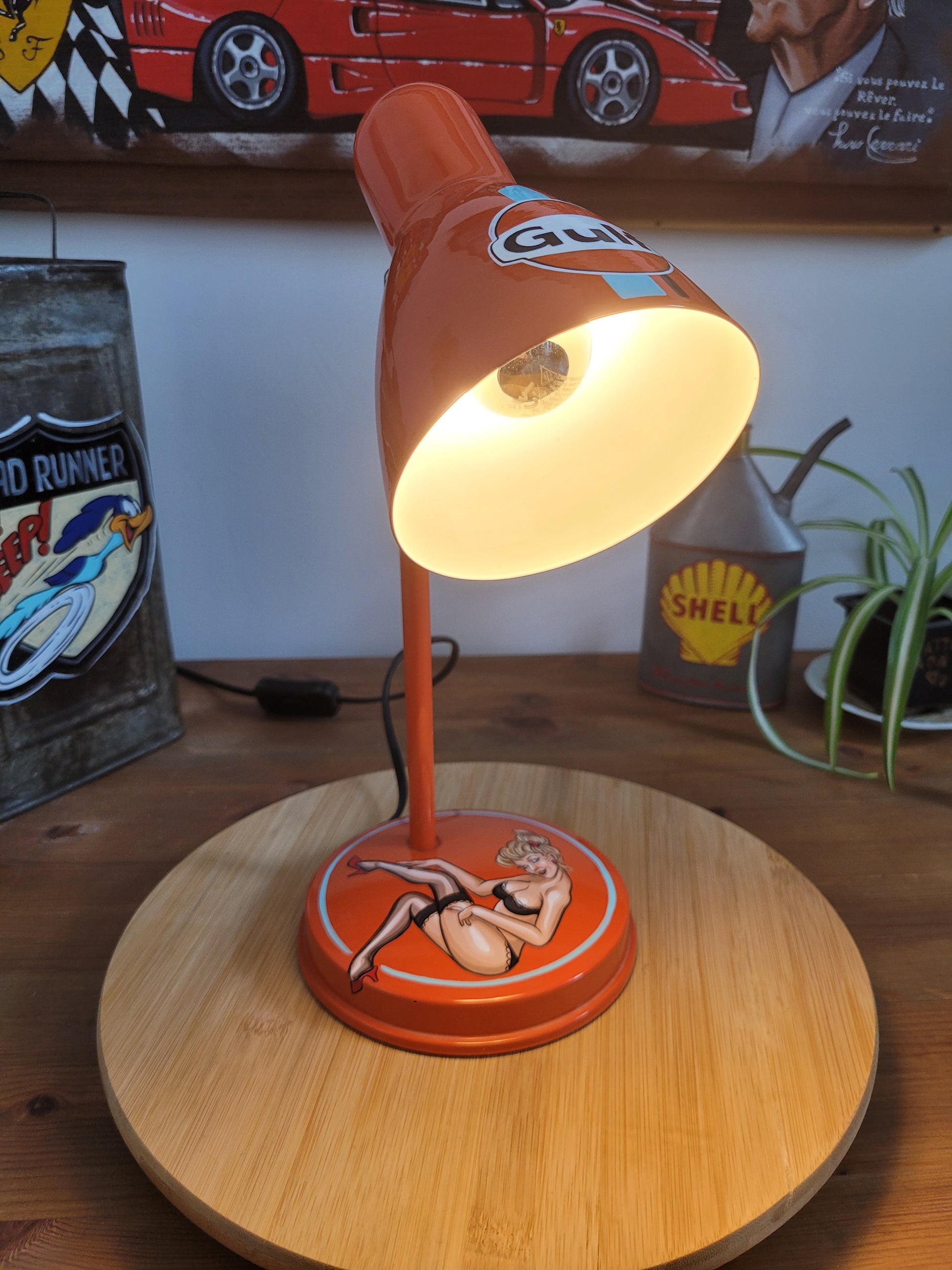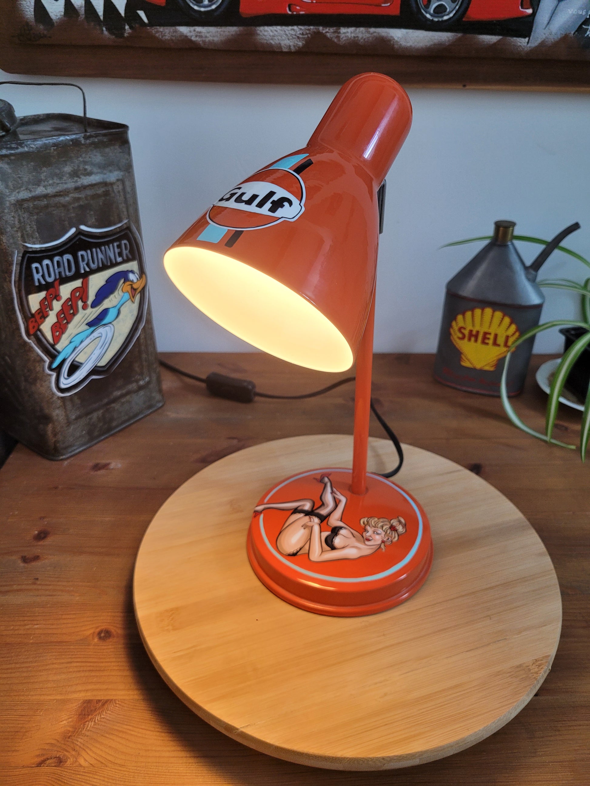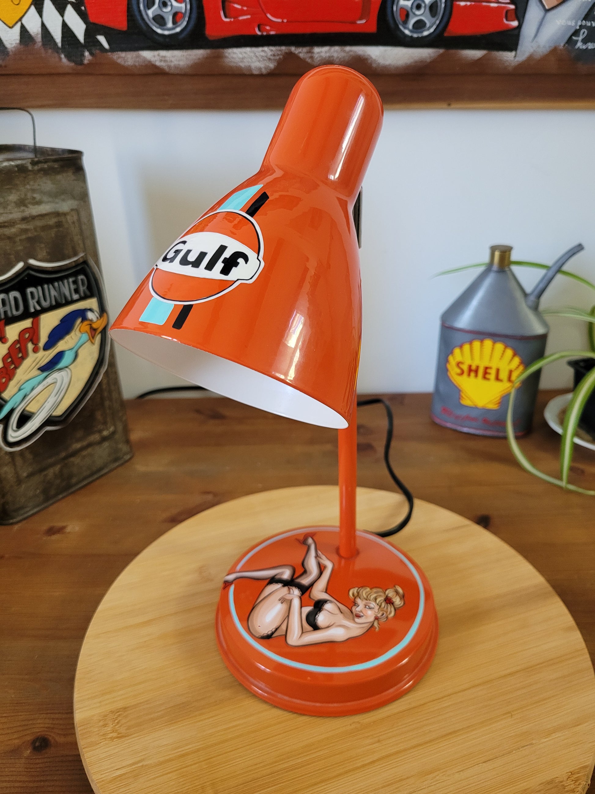Lampe métallique chinée , style Vintage , personnalisée aux couleurs de la célèbre marque Gulf avec une jolie Pin'up pour le glamour .