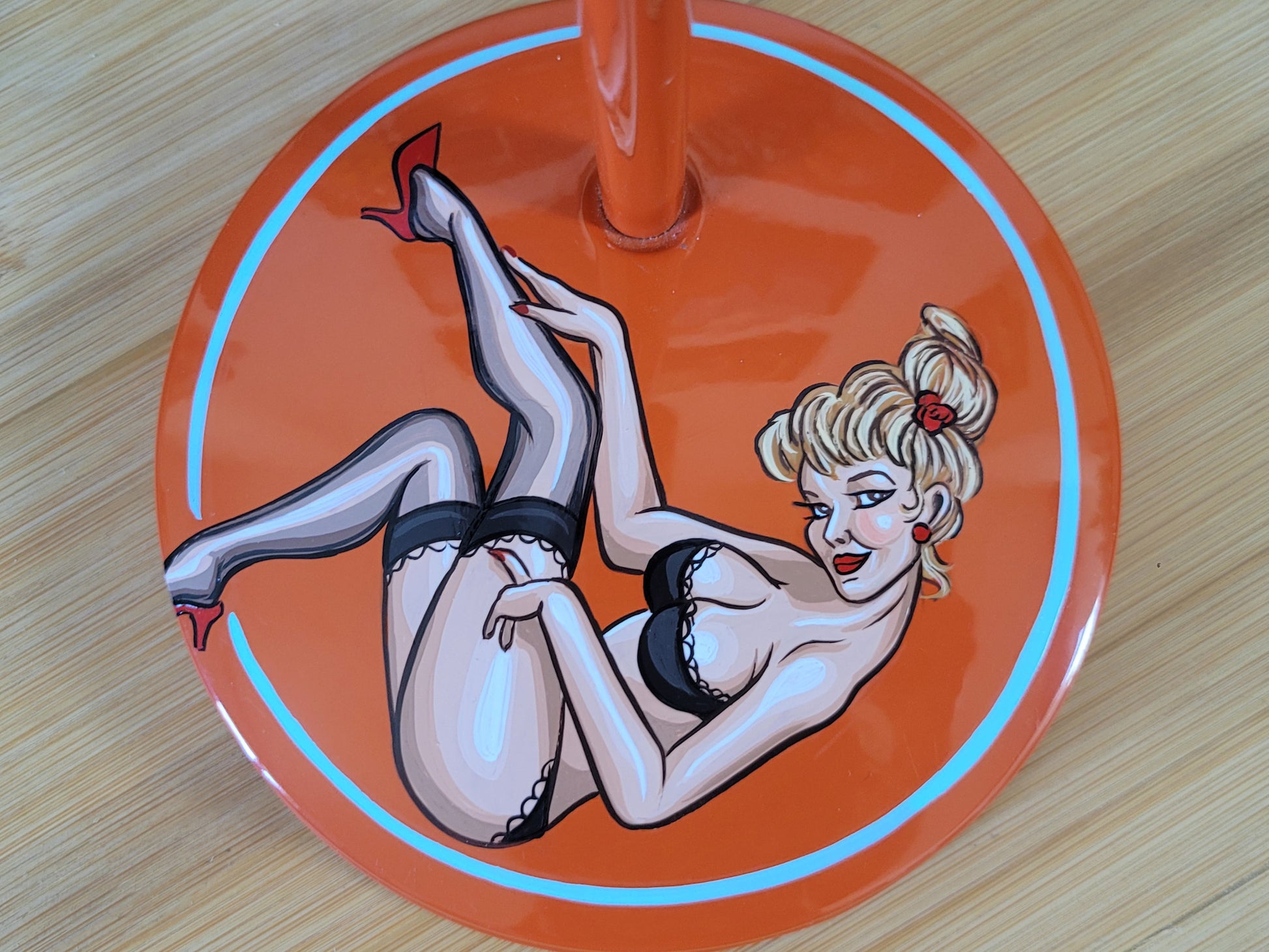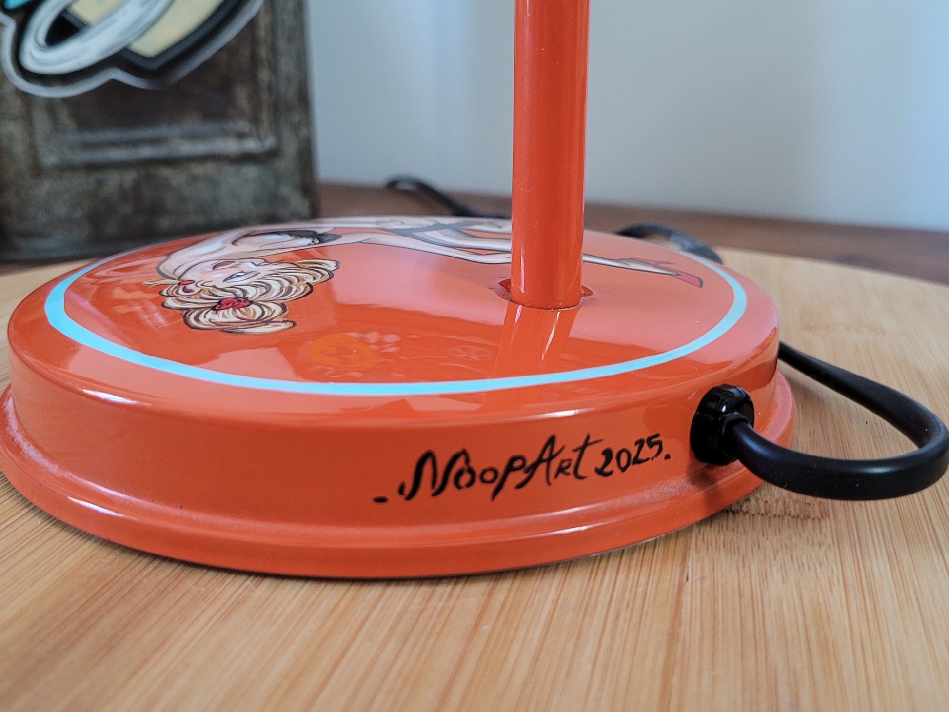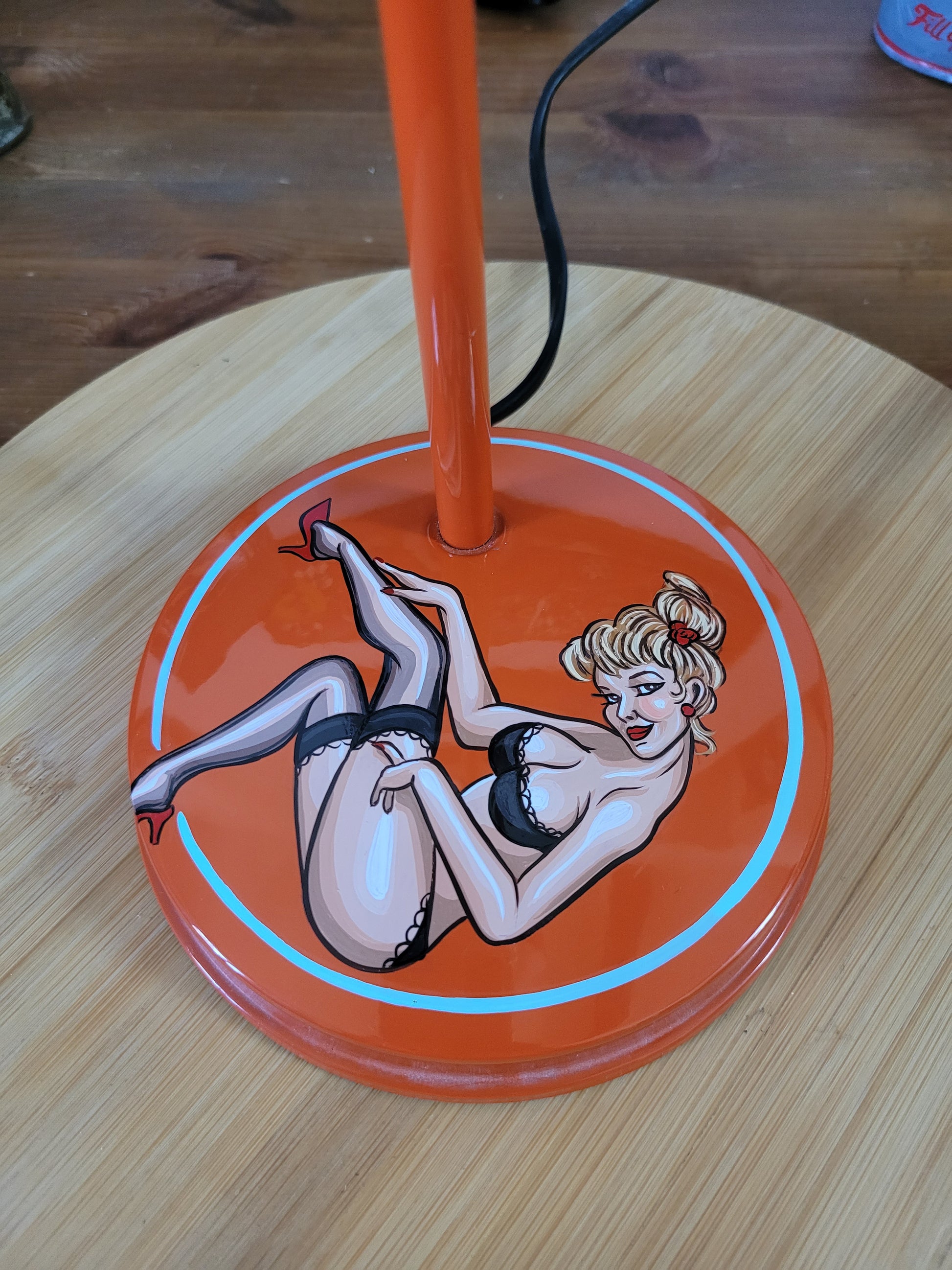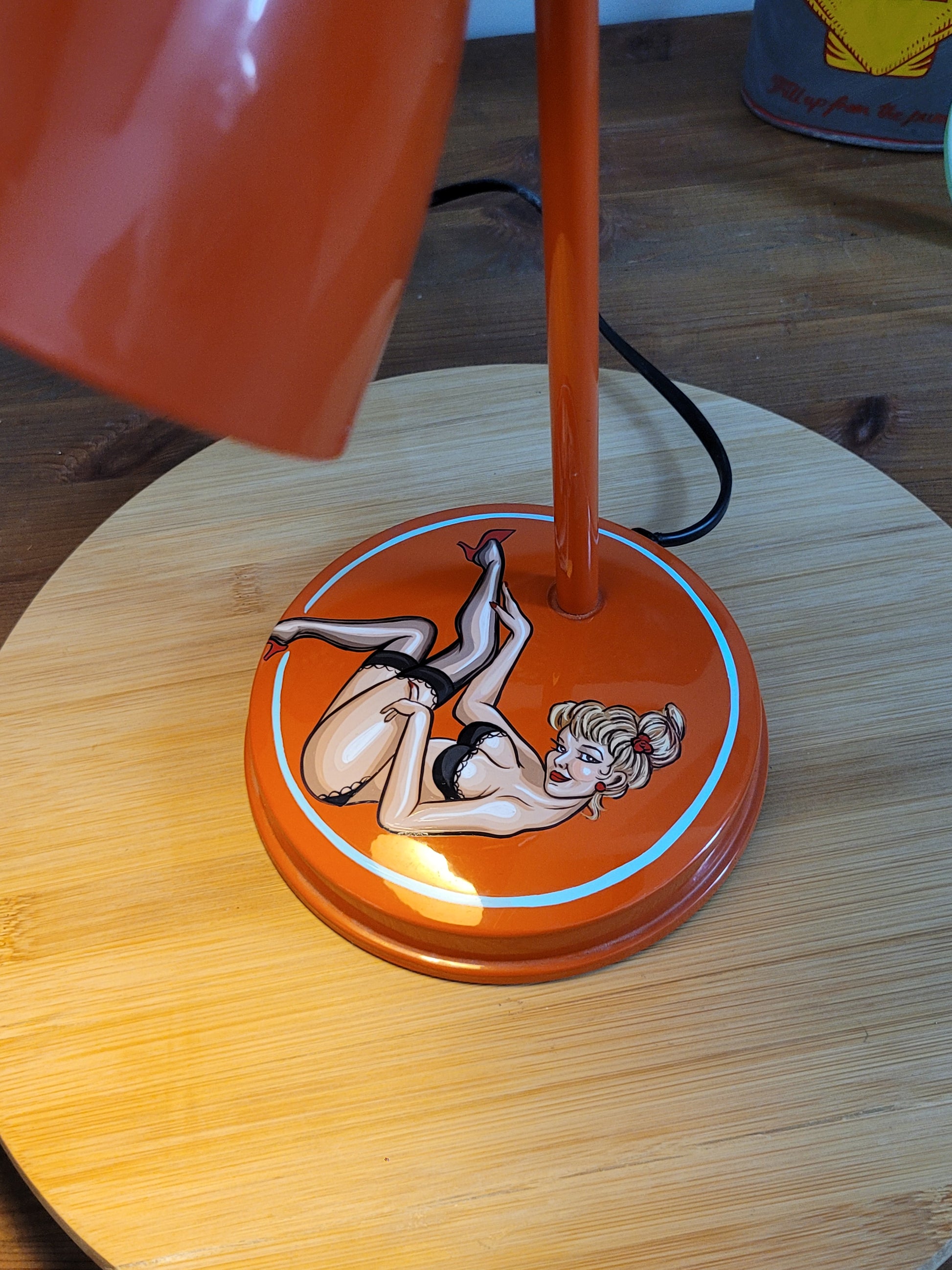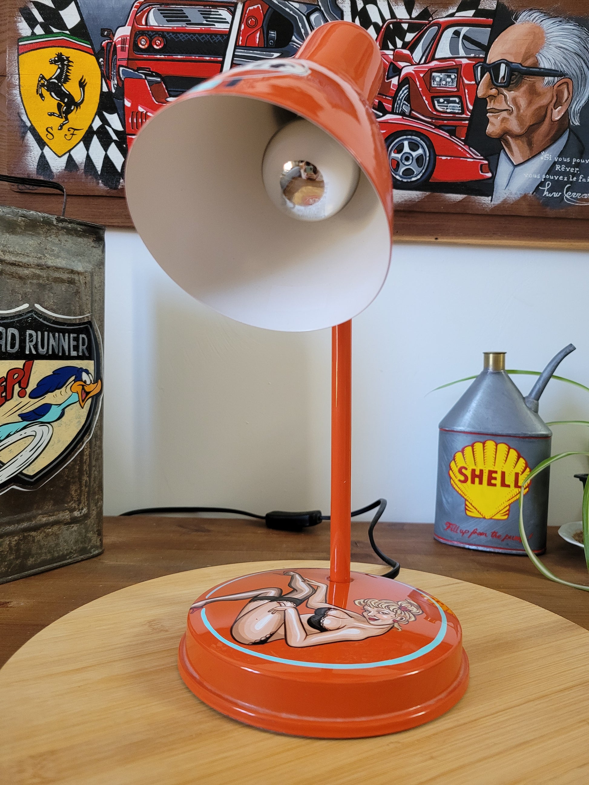 Lampe métallique chinée , style Vintage , personnalisée aux couleurs de la célèbre marque Gulf avec une jolie Pin'up pour le glamour .