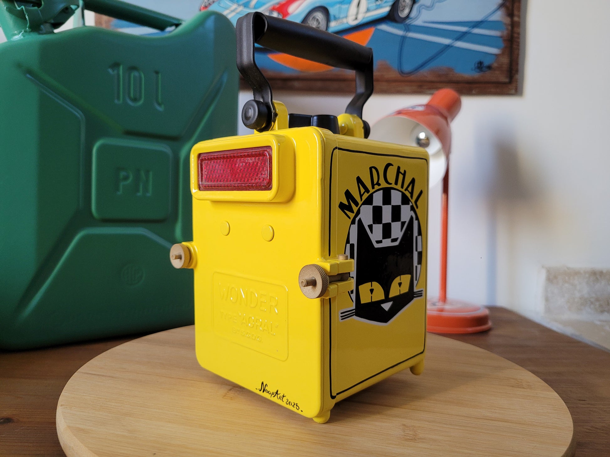 Elle a été restaurée , repeinte et modifiée afin de correspondre au standard électrique actuel . Le tout personnalisé aux couleurs Marchal .