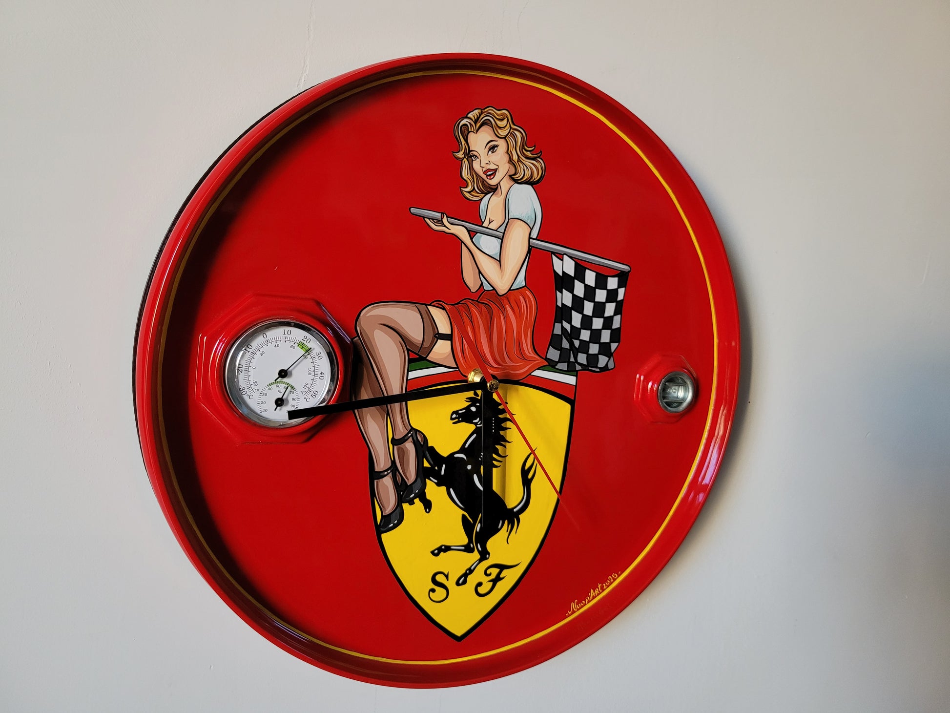Pendule réalisée à partir d'un dessus de bidon de 60L , diamètre 38cm , thermomètre intégré .